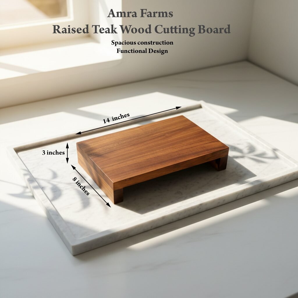 Make chopping and prepping easier and hygienic with the raised teak wood chopping board. The elevated base lets you slide a plate or tray underneath to collect cut ingredients, keeping your kitchen clean and workflow seamless. Crafted from premium teak wood, the surface of the board is made from a single block of wood with no adhesives or chemicals. The legs are attached with screws for extra strength and durability but are not visible at all.